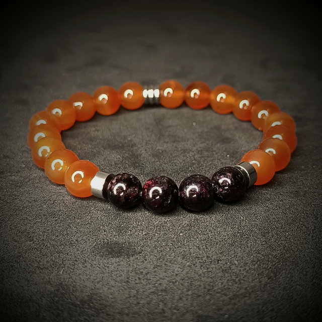Bracelet en cornaline et grenat – perles naturelles 8 mm, monté sur élastique robuste. La cornaline stimule l’énergie vitale et la créativité, tandis que le grenat renforce la force intérieure et la passion. Un bijou chaleureux et puissant, idéal pour raviver l’élan du cœur et de l’esprit.